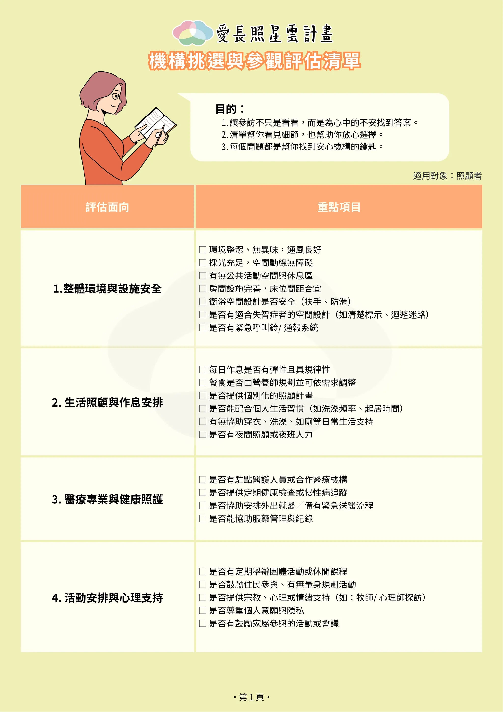▲ 圖說:星雲計畫照顧管家團隊彙集專業知識與實務經驗,編撰一份【機構挑選與參觀評估清單】,如果想多了解此議題,且想透過照顧管家說明、索取完整清單內容,歡迎申請星雲計畫諮詢。點我免費預約諮詢
