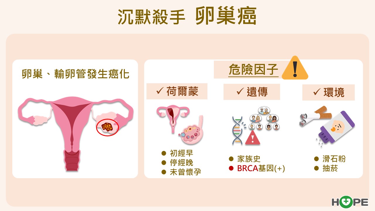卵巢位於骨盆腔深處,大小僅約兩、三公分,卻主宰女性從青春期到更年期的生理週期。鄭雅敏醫師說:「卵巢每個月都在排卵與修復,如果月經來得早、停經晚、沒有懷孕讓它休息,長年持續工作,再加上環境因素、抽菸、滑石粉曝露,或家族中有卵巢癌、乳癌、BRCA基因突變,就可能增加罹癌風險。」
