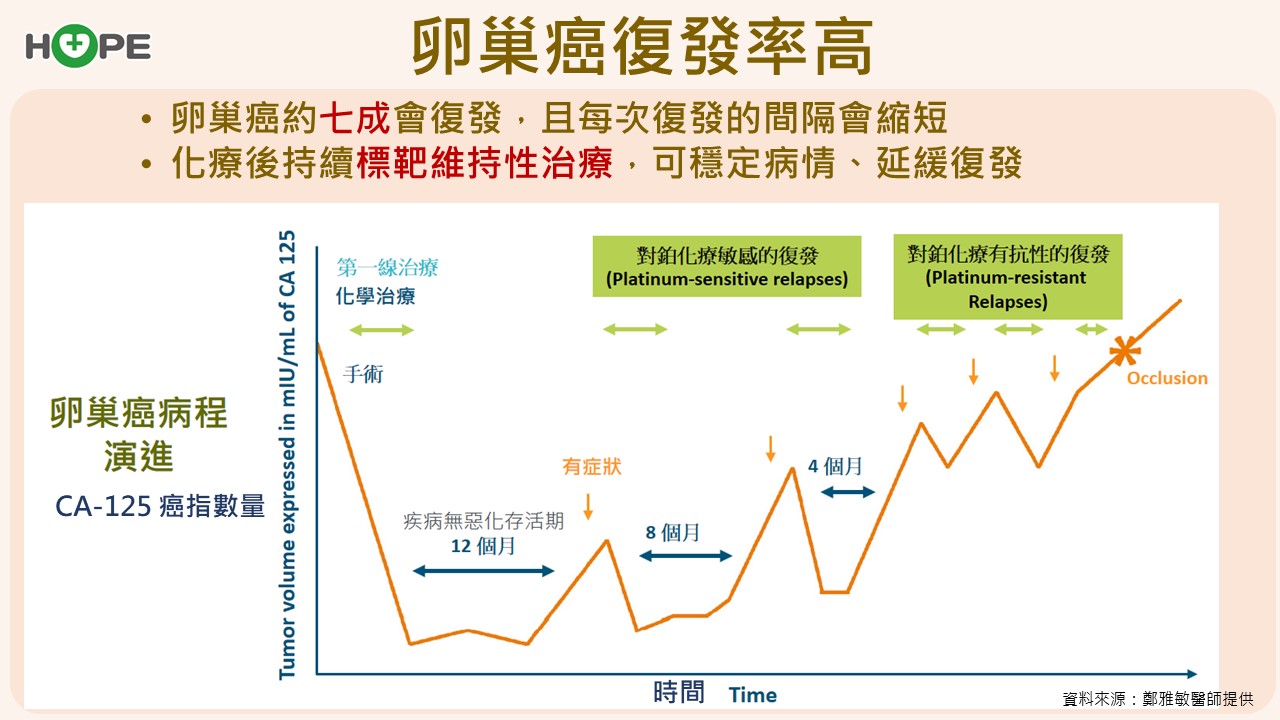 鄭雅敏醫師指出,第三期卵巢癌的復發率高達70%至90%,第四期更達80%至90%,「而且復發間隔會越來越短,第一次可能隔一年,第二次就縮短成八個月。」因此,治療策略的重點不只是把腫瘤清除,更要設法延緩復發。