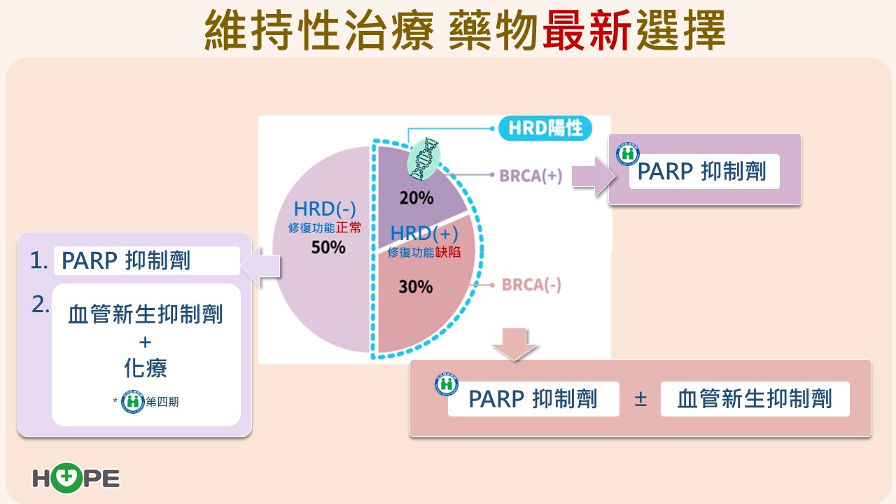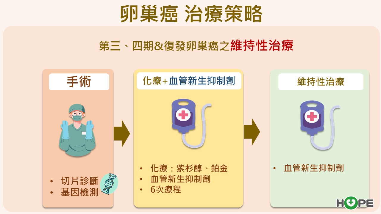 近年已有PARP抑制劑與血管新生抑制劑兩大類維持性治療藥物,可延緩復發、拉長存活期,成為治療上的重大突破。