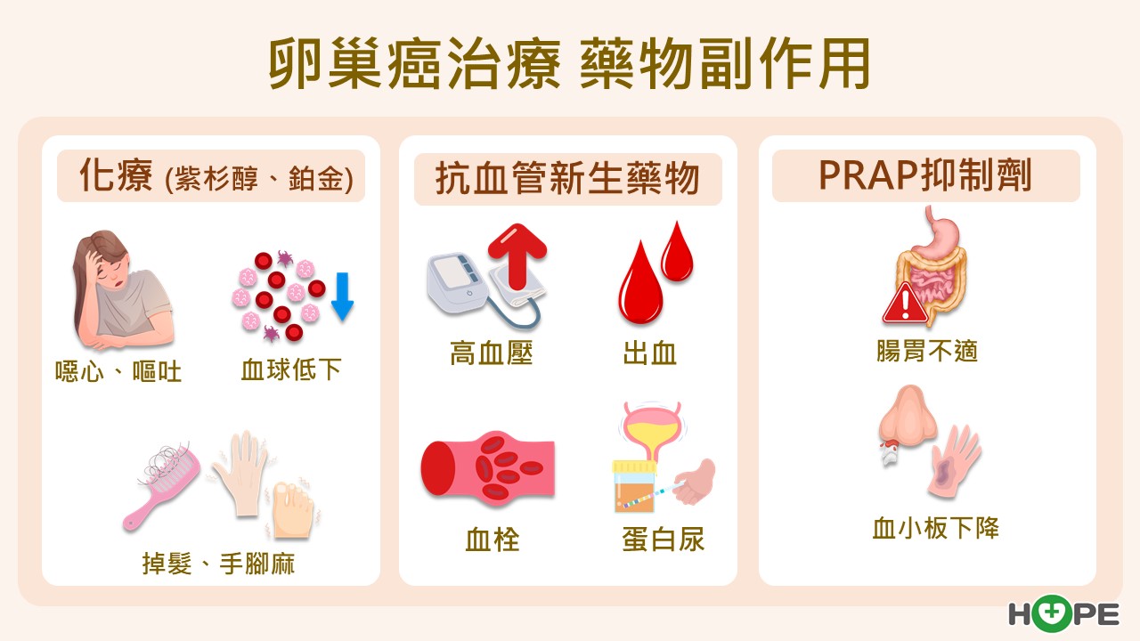 傳統化療常見副作用包括噁心、嘔吐、掉髮、血球下降及手腳麻木;血管新生抑制劑可能引起高血壓、出血、蛋白尿或血栓;PARP抑制劑則可能造成胃腸不適或血小板下降。