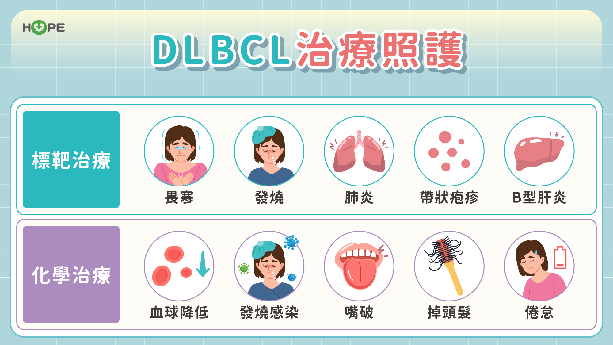 不同治療帶來的副作用各不相同。傳統化療常見血球降低、感染風險上升、口腔潰瘍、掉髮等問題;ADC 藥物可能造成手腳末端感覺麻木、腸胃蠕動異常;CAR-T 與雙特異性抗體需留意「細胞激素釋放症候群」,病人可能出現發燒、呼吸急促、短暫語言障礙,但大多在處理後可以恢復。