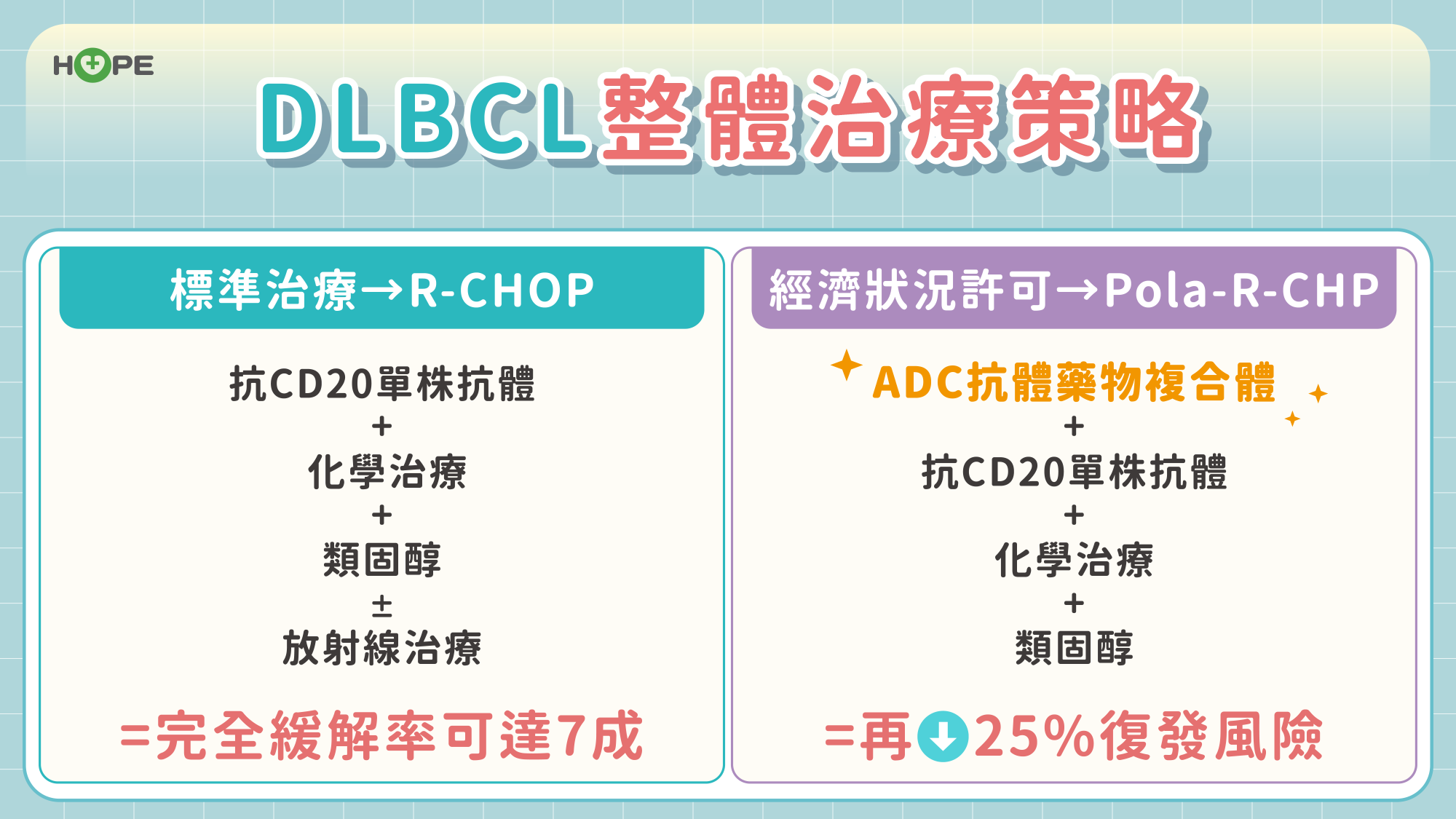 目前標準療法是 R-CHOP,結合 CD20 單株抗體與化療藥、類固醇,完全緩解率達七成。近年研究發現,將其中一款化療藥換成 ADC(抗體藥物複合體),搭配形成 Pola-R-CHP治療方案,可讓部分特定病人的復發風險再下降約四分之一。不過,這項療法尚未納入健保,需自費使用。
