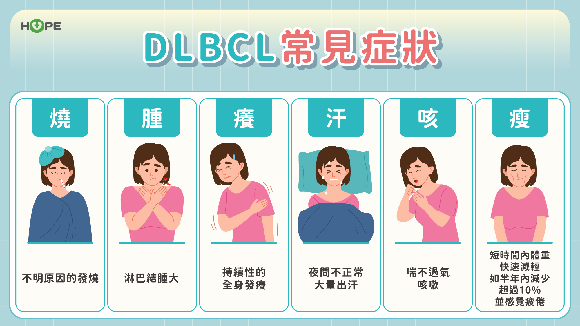 可以記得六字口訣「燒、腫、癢、汗、咳、瘦」,一旦出現這些症狀,務必及早就醫檢查。