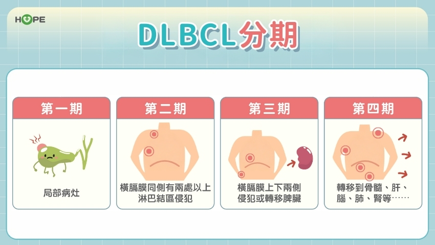 DLBCL 分期依侵犯範圍而定。侷限於單一區域為第一期;同側橫膈膜以上有兩處以上淋巴結受影響為第二期;若上下橫膈膜皆有犯,或波及脾臟,則為第三期;若已轉移至骨髓、肝臟、腦或腎臟,則是第四期。