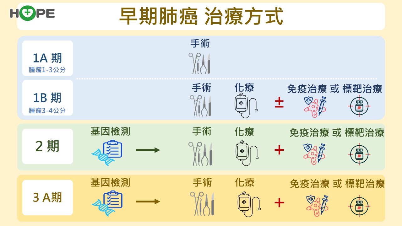 新北市立土城醫院血液腫瘤科主任吳教恩醫師表示,尚未遠端轉移,可以手術切除,皆為早期肺癌。早期肺癌包括,第一期:腫瘤小於四公分、沒有淋巴轉移;第二期:四至七公分,或局部淋巴結轉移;第三A期:腫瘤轉移至同側或縱膈腔淋巴結。