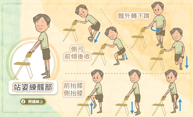 保持站姿,可以扶住椅子保持平衡。將膝蓋往前抬起、放下後,再往外側抬起、放下。如此反覆練習後再換邊。