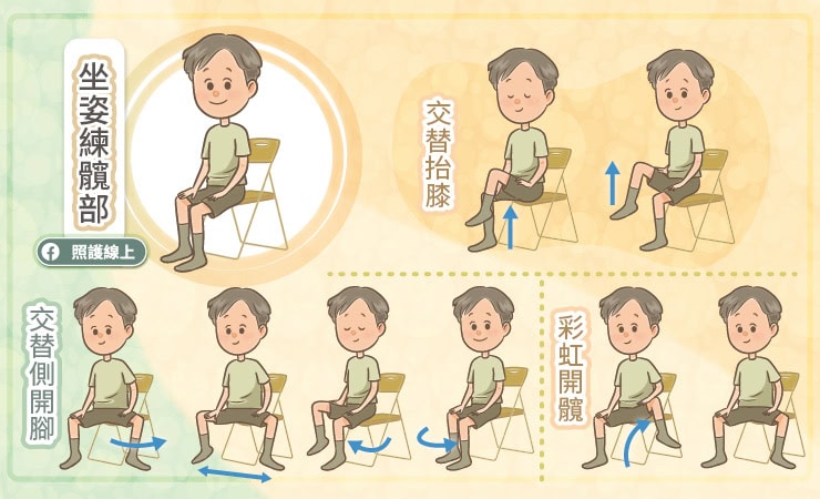 開始抬起一側大腿,停留一下後再放下,換抬起另一邊,如此交替進行。如果椅子有扶手的話可以讓手臂輕放在扶手上,也可以讓雙手臂自然垂放兩側,或放在大腿上。