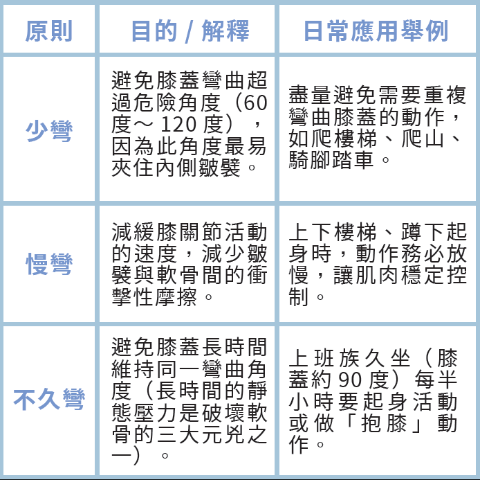 他解釋,這些原則包括平常生活、工作、環境甚至運動都要注意。以運動為例,騎腳踏車時膝蓋得重複一直彎曲,如果有膝蓋痛你就要避免腳踏車,若真的非騎不可,則要注意「慢慢彎」。