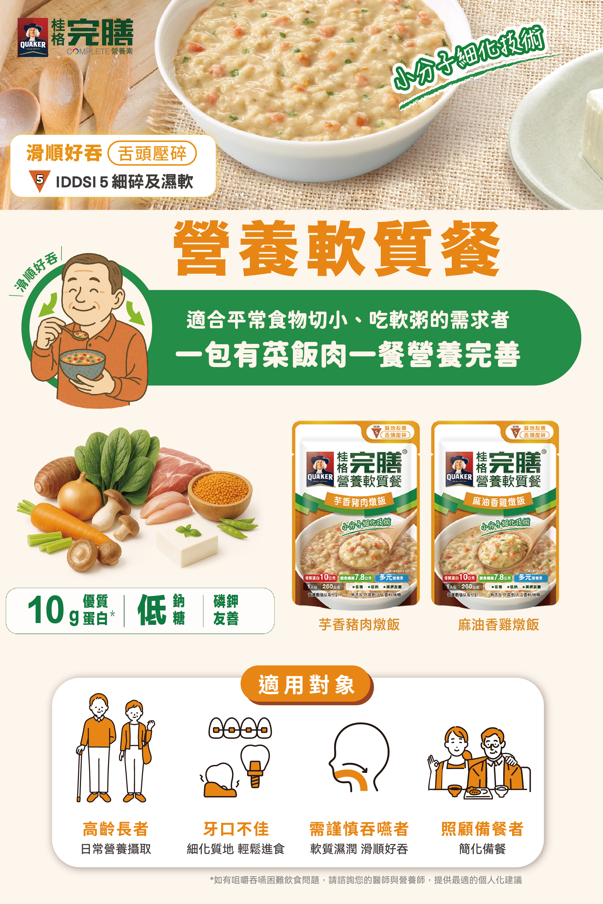 ② 照護特殊飲食需求:選用10多種新鮮食材,經小分子細化技術處理,有別於一般粥!質地均一好吞食,好消化好吸收。應用食材辛香料復刻懷舊古早味,如:麻油香雞燉飯、芋香豬肉燉飯等,而且低糖低鈉 磷鉀友善,照護更放心。