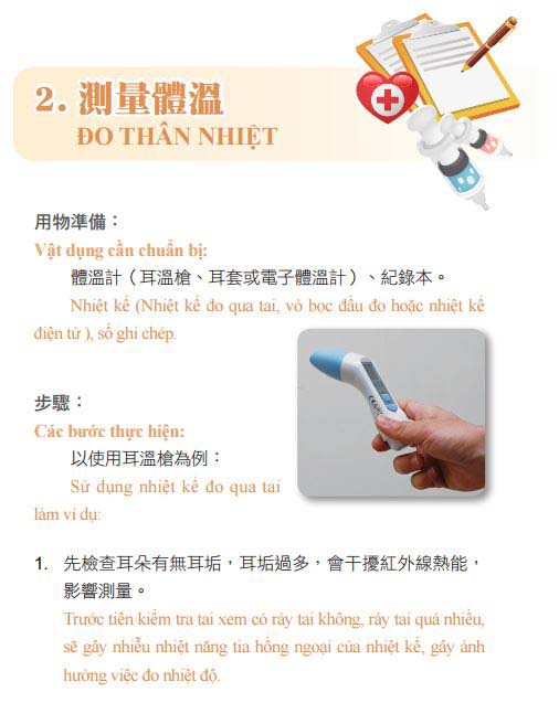 《臺北市外籍看護照護手冊》的內容包括了有:「判斷生命徵象」、「身體照顧」、「管路照顧」等章節,包括基本的手部清潔、測量體溫、脈搏、血壓、等注意事項。