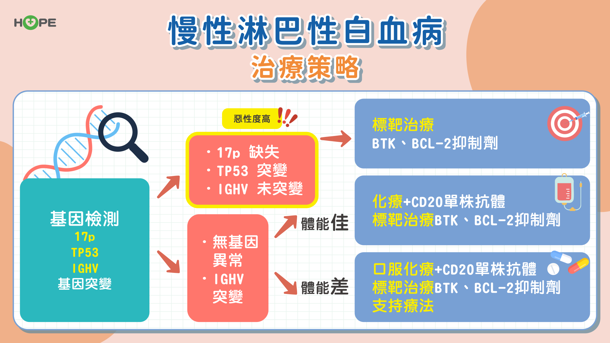 若檢測結果顯示 17p 缺失、 TP53 突變或 IGHV 未突變,代表病情屬於高風險族群,傳統化療效果有限,因此建議以標靶治療為主,例如新一代BTK 抑制劑或 BCL-2 抑制劑,能有效抑制癌細胞生長並延長存活。若檢測結果為無基因異常或 IGHV已突變,則治療反應通常較佳,選擇較為多元。