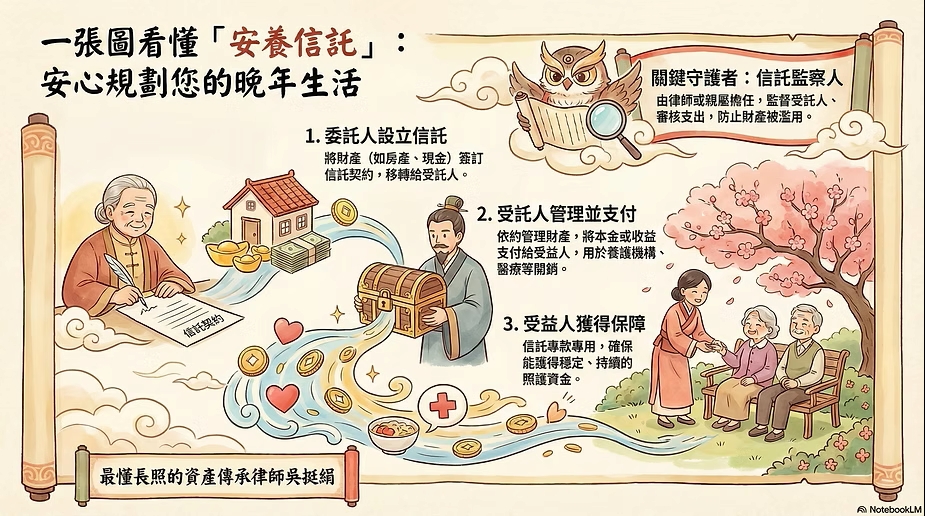 透過信託契約,這筆錢就能依約定,定期支付生活費、看護費,甚至是未來入住養生村或安養機構的費用。
