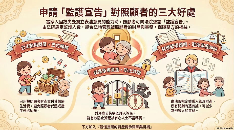 如果您已經身處照顧現場,家人因失智或生病失能而無法自理,那麼「監護宣告」就是保護您與家人的關鍵法律工具。