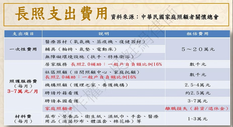 根據中華民國家庭照顧者關懷總會(家總)的統計,長期照顧的財務輪廓如下: