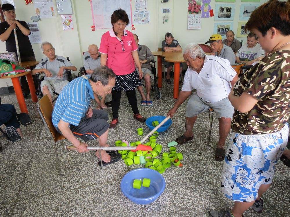 「老人很忙!」林內町的老人家們可不是睜眼、閉眼,等著一天過一年,每天都行程滿滿。公佈欄有每週活動表,晨起沐浴、種菜、散步後,進行手部保齡球、乒乓球、套圈圈等運動;下午學習摺衣服、或來場記憶大考驗;依據每位長輩的身體狀況,還會另安排站立、學步車練習等課程。其中一個重要環節,就是定時給水、定時排泄,讓他們達到自立支援照顧中的重要目標—零尿布。